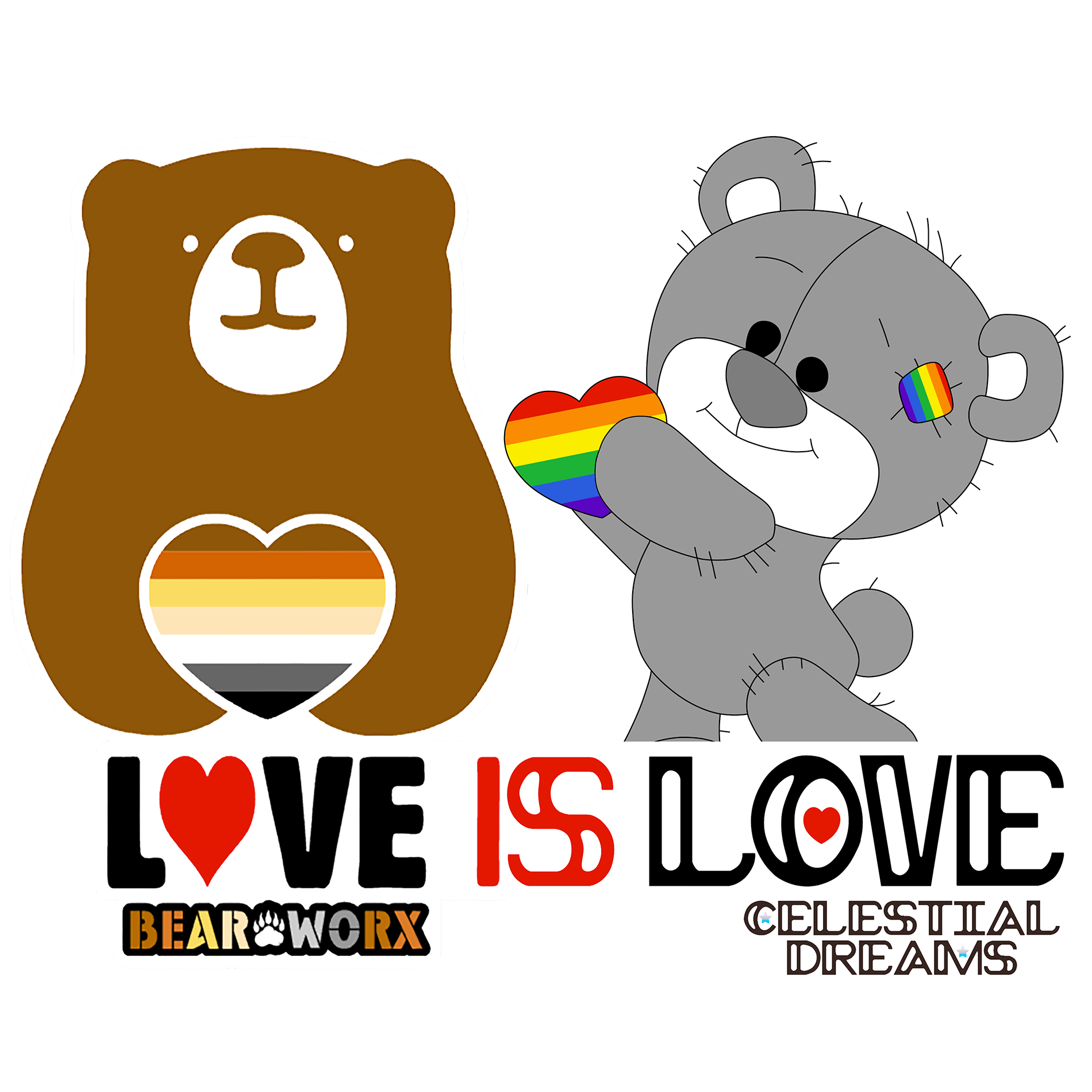 This Love is Love design was created by S Fudge of Celestial Dreams. When asked what the “Love is Love” message meant to her, she said “Love is Love- It doesn’t matter who you love as long as you’re not a d!ck about it!” This design features Patch, a Celestial Dreams character, shown in grey presenting a pride heart to the Bear Worx Bear. If you like this design, you can find more Celestial Dreams designs by visiting celestialdreams.ca